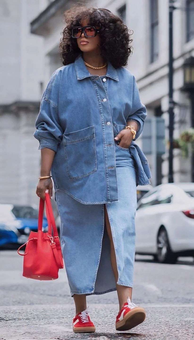 Want to spice it up? Try a denim maxi skirt with a cropped jacket — trust me, it’s a vibe. The secret is mixing washes — light with dark, distressed with clean — so it looks styled, not accidental. Add a white tee or a striped shirt underneath to break up the blue. Top it off with fresh white sneakers for day or heeled boots for dinner.